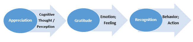 But first it might make sense to clarify the meaning of words like appreciation, gratitude and recognition. They are often used interchangeably but they are not synonymous. What’s more, not everyone agrees on what these terms mean. The Wharton School of Business defines recognition as the act of expressing appreciation or gratitude. It is a behavior. Whereas appreciation is about seeing or perceiving what someone did that was worthy. Appreciation therefore is a thought or perception. And gratitude is about feeling thankful as a direct beneficiary or on behalf of someone’s actions. Gratitude is an emotion. So it would be correct to say that an employer might appreciate an employee’s worth to a company (an observation), feel grateful for that person’s contributions (an emotion), and recognize those efforts by personally thanking that employee or giving that employee an award or bonus (an action).